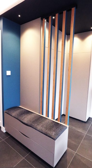 Aménagement d’une entrée esthétique avec rangements intégrés ainsi que d’une cuisine design et fonctionnelle.