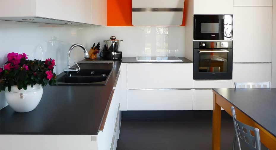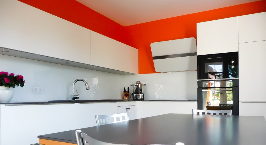 Création de façades sur mesure pour habiller le placard mural et table existante recouverte du même matériau que le reste de la cuisine.