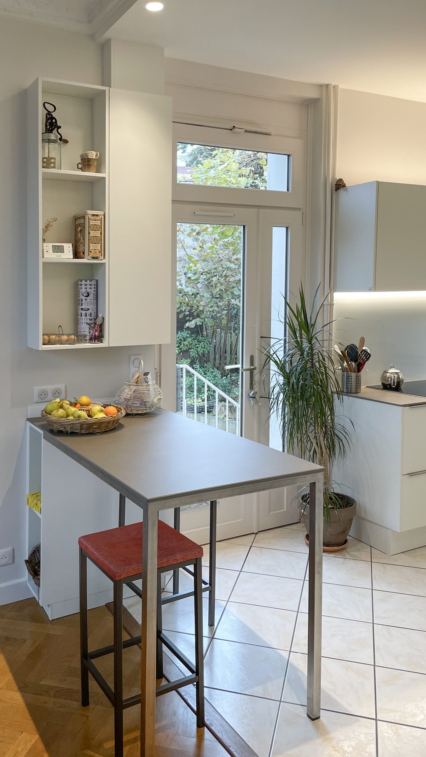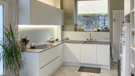 Modèle Ceres, blanc firn, de chez LEICHT avec plan de travail en céramique Barro. Look intemporel pour cette charmante cuisine de 14m2.
